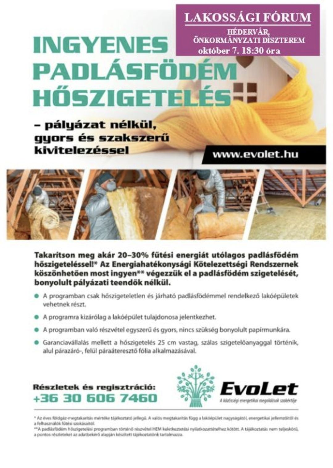 Az ingyenes padlásfödém hőszigetelési programmal kapcsolatban Héderváron az Önkormányzat dísztermébe a kivitelező cég lakossági fórumot szervez október 7-én 18.30- kor.