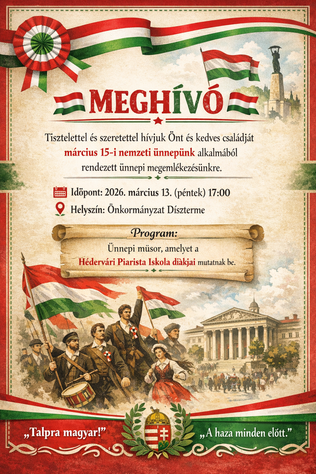 2026.03.13-án 17 órakor szeretettel várunk mindenkit, hogy együtt emlékezzünk az 1848/49- es forradalom és szabadságharc hőseire!