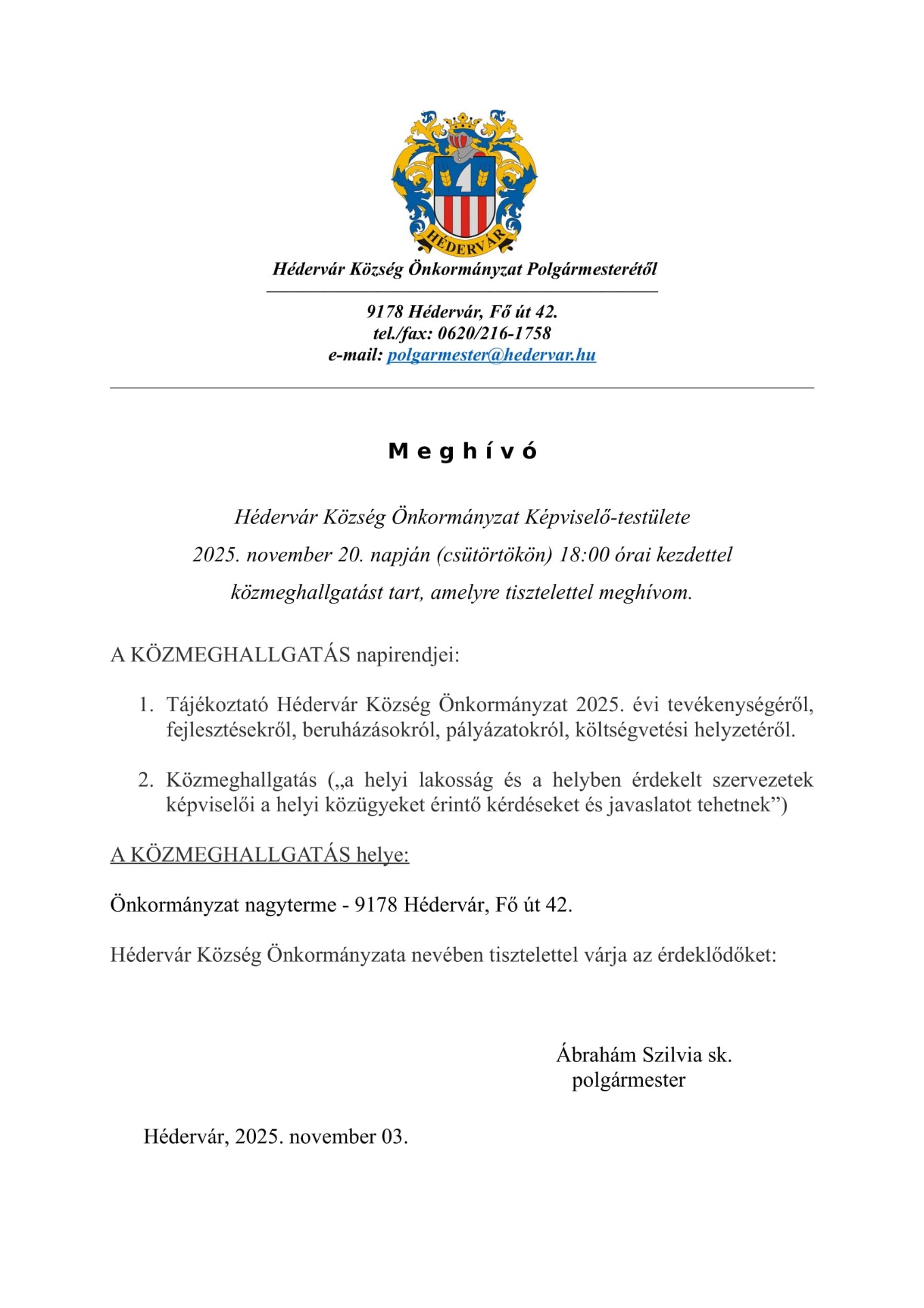 Hédervár Község Önkormányzat Képviselő-testülete 2025. november 20. napján (csütörtökön) 18.00 órai kezdettel közmeghallgatást tart, amelyre tisztelettel meghívom.